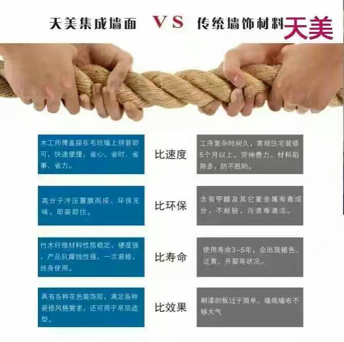 天美竹木纤维防潮墙面——产品采用竹粉和树脂合成,无气味,无甲醛。即装即住!产品效果:保温/隔热、隔音(经国家权威检测隔音达29分贝,相当于实体墙隔音)防火(国家权威检测达到B1级),超强硬度,防潮(泡在水里也没事)有效解决了江南一带梅雨季节房屋潮湿,墙面掉皮、起泡、翘边等现象~易清洁,超强硬度,绿色环保。高端经济快装,直接作用于毛坯房直装。省掉泥工,木工,油漆工三种工钱和材料费用,让您真正实现装修省钱!无后顾之忧!