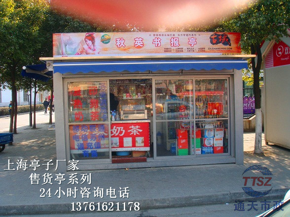 上海通天市政工程有限公司制作的售货亭是伴随着现代商业的发展,大型商场、购物中心、商业街出现了一种新型售卖亭。这种新的展示方法使用灵活,造型多样新颖,并可多角度展示商品和品牌形象。在商场内可放至大型通道中间,顾客可围着售卖亭行走,多角度看到商品。也有一些大型售卖亭位于商场外广场或街边。这种售卖亭多以休闲水吧、咖啡吧、工艺礼品等采用。这种展亭式售货亭发挥了极佳的展示效果,又充分利用了商场的空间,使空间的利用与艺术售货亭很好地结合起来,这种售货亭现已被各大商场和商业街所采用。