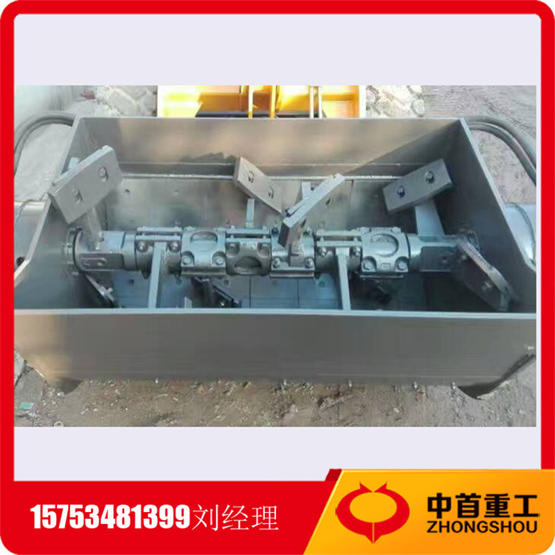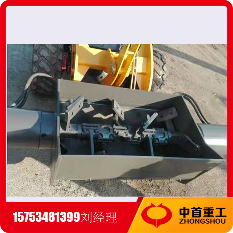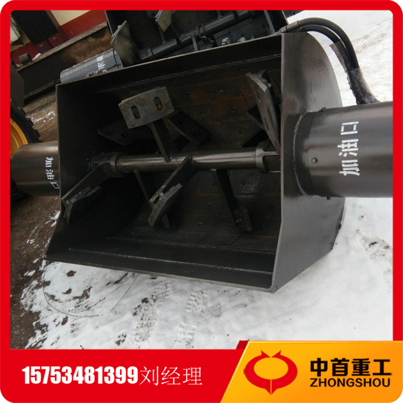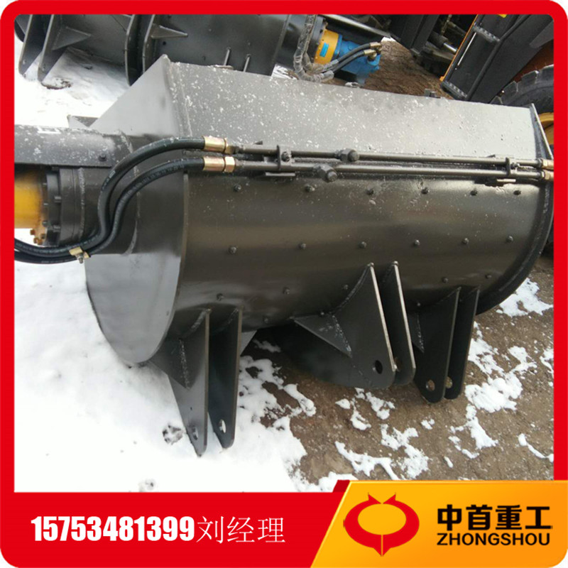 本发明利用成熟的装载机生产技术和强制式混凝土搅拌机生产技术,把强制式混凝土搅拌机经过改装安装在装载机的铲斗位置,利用装载机的液压传动装置驱动搅拌机工作,既可发挥装载机方便的移动性能和自行上料、卸料的优势,又可以利用强制式混凝土搅拌机的拌合功能,一台机械即可实现上料、拌合、转场、卸料的多重功能。克服混凝土工程施工过程中使用机械多、人员多、占用场地大、对电源依赖性大等缺点,实现一机多用,灵活方便,有效降低施工成本和能源消耗的目的,节能减排。铲斗式搅拌缸是其关键部位。