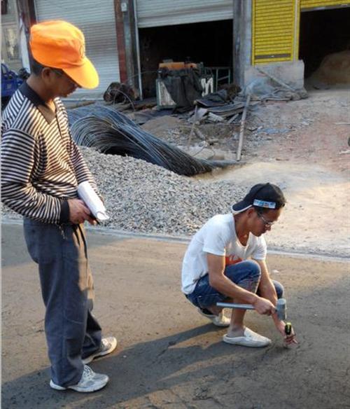 冷再生机一次破碎拌合宽度为2.4米,工作时需有一辆水罐车紧跟作业保证拌合用水,拌合过程中按照试验单所规定的高于佳含水量1-2%控制用水(前提是需要知道再生机能打开几个水喷嘴来换算含水量),另有一辆水罐车需满水随时处于待命状态,一旦跟再生机作业的水罐没水了,需即刻补上。以保证冷再生机的持续作业能力。冷再生机行进速度应根据路面损坏状况和再生深度进行调整,一般为6m/min~12m/min,使得铣刨后料的级配波动范围不大。网裂严重地段应降低再生机组行进速度,提高铣刨转子转速。如旧路面层结构层厚度大于8cm,冷再生机行走困难,则需先由冷再生机对旧路面层进行铣刨后,在破碎料上再铺水泥,进行冷再生拌合施工。冷再生工作过程中需要人员跟随随时检查拌合深度和湿度,一般以20米一点为准。如有不合格要及时跟司机反映以便解决。每冷再生施工作业时,振动压路机必须跟在冷再生机后侧20m处,对拌合完的混合料及时采用高幅低频振动碾压一遍,速度等同于冷再生机的行车速度。目的趁佳含水量时把水封在混合料里。