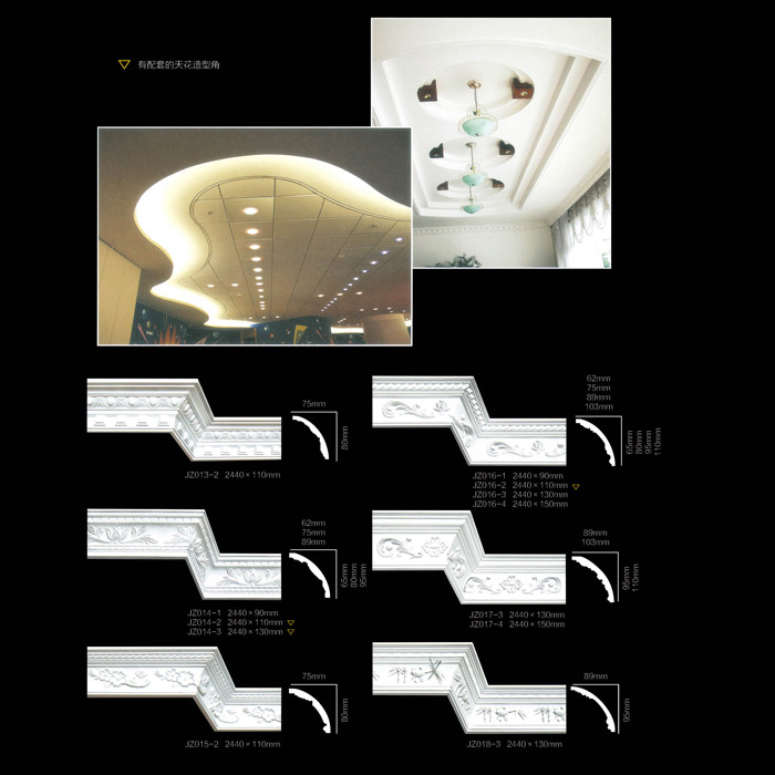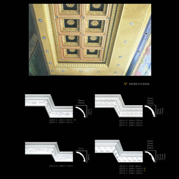 公司主要产品有顶角线、平线、罗马柱、角花、门头花、灯、浮雕、梁托等十多个系列数百个品种。产品外观清晰、表面光洁、立体感强。同时也可按需订做各种异型石膏线和石膏花。本公司自王研制的粘接粉,工艺先进,粘接力强,不收缩,操作简单,稳定性
