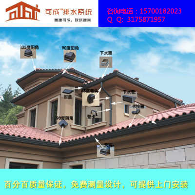 杭州可成紧跟世界流行风格,发掘人文发展趋势的审美取向,赋予产品生命活力,蕴含丰富的文化气息,承载更多的生活感受;借鉴时尚、简约、经典等最新流行款式设计风格,汲其精髓,寻求设计灵感,推陈出新,力图打造别具一格的落水应用系统。是一种引进国外技术及理念替代传统笨重混泥石结构的屋檐落水糸统,它有大大减负房屋结枸重量,以及起到屋檐装饰美观作用.并且施工维修较为方便等好处.彩铝落水系统原料采用高科技的耐候配方,使用寿命长,抗老化,在恶劣的环境下也不会发生退色,剥落和腐蚀现象,同时,从国外引入新型元素的添加剂,符合绿色环保的要求。落水系统管件品种齐全,安装简捷方便,并配有专业化的施工队伍及营销网络。成为发展商,建筑承包商,建筑师及业主的首选品牌。
