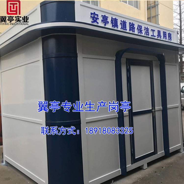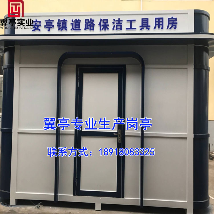 YT-D06环卫工具保洁房是上海翼亭岗亭厂家为上海市安亭镇量身定制的环卫保洁工具用房、设计美观,门框用弧形的设计加以点缀、让整个岗亭更加的高端、配置合理,顶部有醒目的安亭镇道路工具保洁用房发光字、整个岗亭质量过硬,均采用国标材质、稳固耐用。