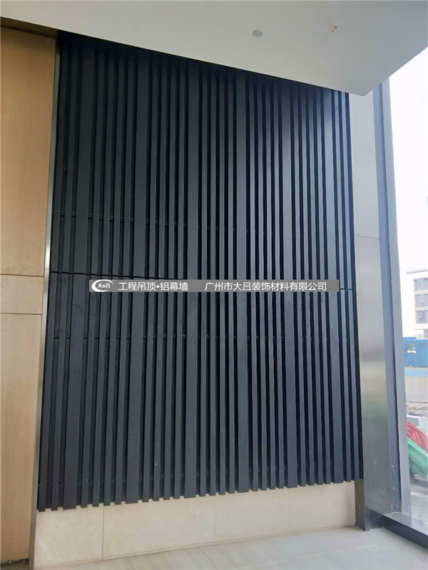 1F前台大厅墙面采用的是白.黑铝单板和白.黑铝方管先拼装再装上墙面。这样铝方管所造成的线条感很强烈。