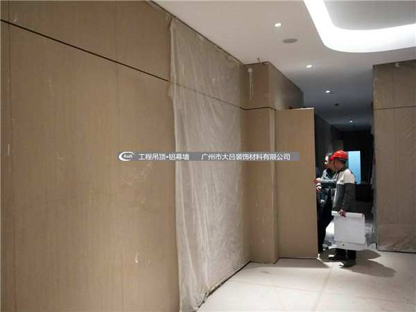 吊顶采用的是勾搭铝蜂窝板吊顶,蜂窝板厚度12.2mm,蜂窝芯10.5,面板1.0,背板0.7.中间和四周留灯槽。勾搭铝蜂窝板吊顶容易安装,效果很好。