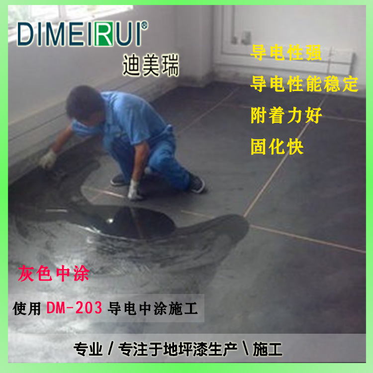 防静电地坪涂料厂家直供DM-203 (3:1导电中涂环地坪漆)系我司优选进口环氧树脂,进口导电填料,并配合进口固化剂等原材料,通过先进的生产工艺调配而成,是一种VOC含量低、高粘结强度,高导电性能的导电中涂材料。