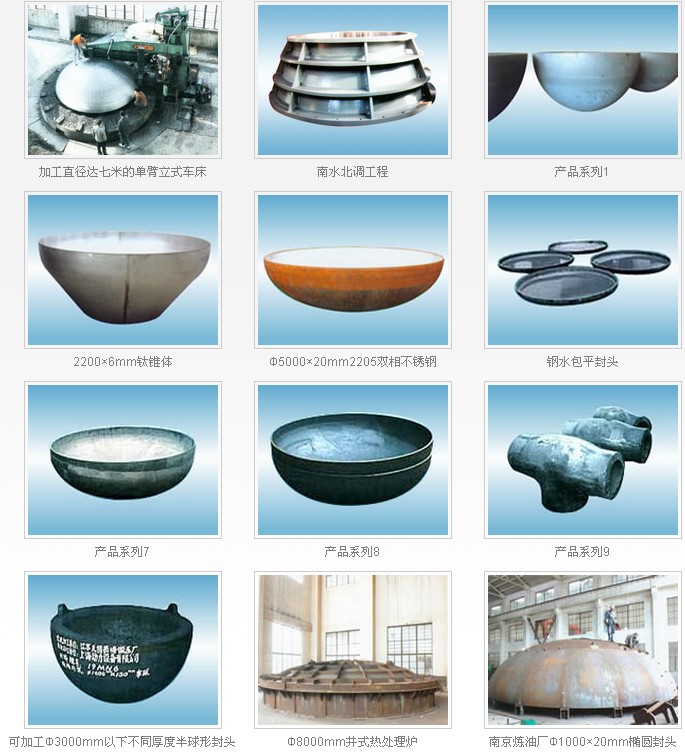 无锡市前洲西塘锻压有限公司可向用户提供椭圆、碟形、锥形、半球型、平底、钛封头、铜封头、锆封头、铝封头、太空铝封头、哈氏合金封头、因康镍板封头、蒙乃尔封头、大型瓜片封头,还可生产各种大型管件和非标冲压件,公司配套设备齐全,有可供加工直径7000mm,单件重量40吨的单臂立式车床,有加工直径3200mm,单件重量30吨的双立柱立式车床,有专为封头切边的半自动切边机,¢8000mm井式热处理炉、X探伤室、理化室、高低温红外线测温仪(-25——1200 ℃,700——1400 ℃),车间配有相应的起重设备,有五吨油叉车二台,三吨油叉车一台,为封头高质量生产提供了足够的硬件保证。
