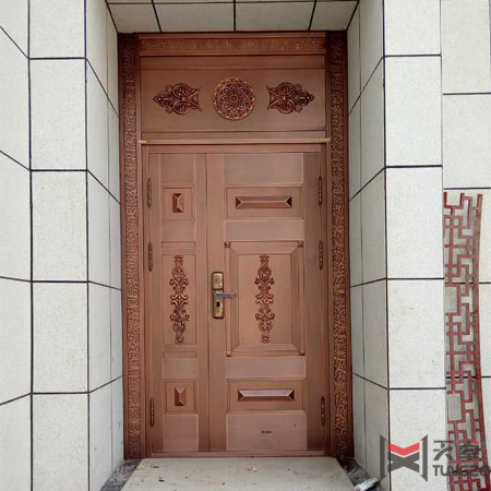 铜门尺寸:非标准,可根据现场定制; 铜板厚度:0.8/1.0/1.2mm洛阳紫铜板;