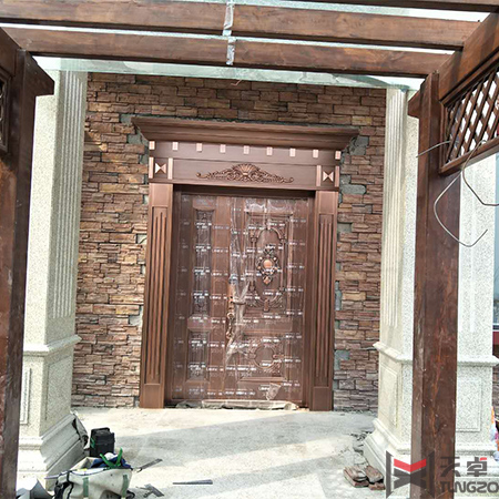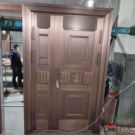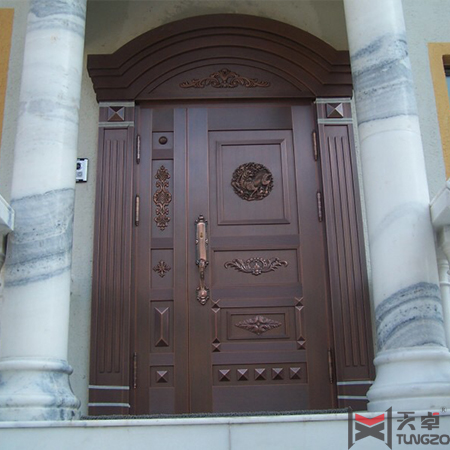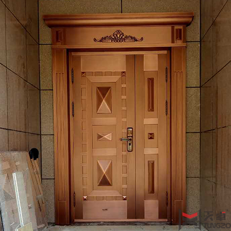 这款别墅进户铜门 TZ-009,是陕西等西北地区别墅进户铜门产品中较为受欢迎的一款。该款铜门选用“洛阳铜材”,简单大气的模压样式,是别墅进户铜门的经典产品。