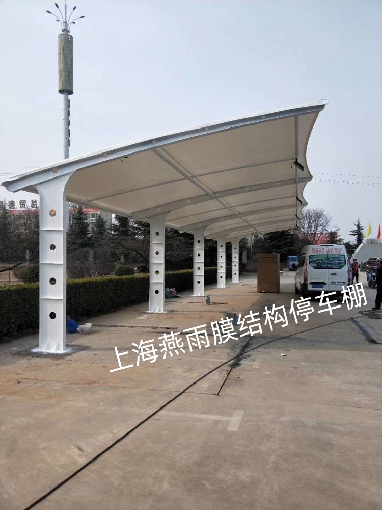 膜结构停车棚2.艺术性:除了一般雨蓬不可比拟的实用、耐用、遮风挡雨的功能外,膜结构雨蓬更是一座雕塑,一件艺术品,给人美的视觉享受。其柔美,其曲线,其刚柔并济,其丰富造型,其洁白无瑕,让人眼前一亮,回味悠长。