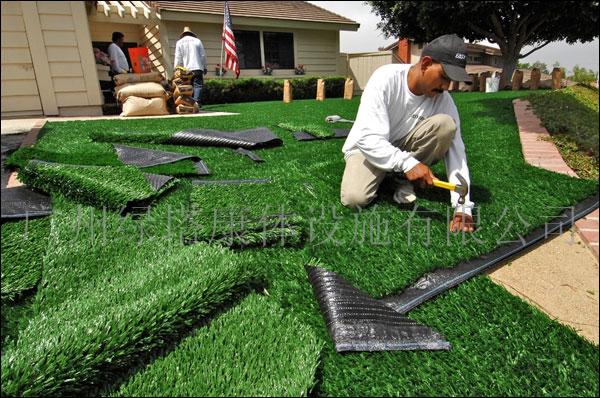 3、开始铺设人造草坪:在草坪接合面处铺装上拼接带,并用钢钉固定于其上,钢钉头不可凸起,接合区需交接重合10㎝以上。