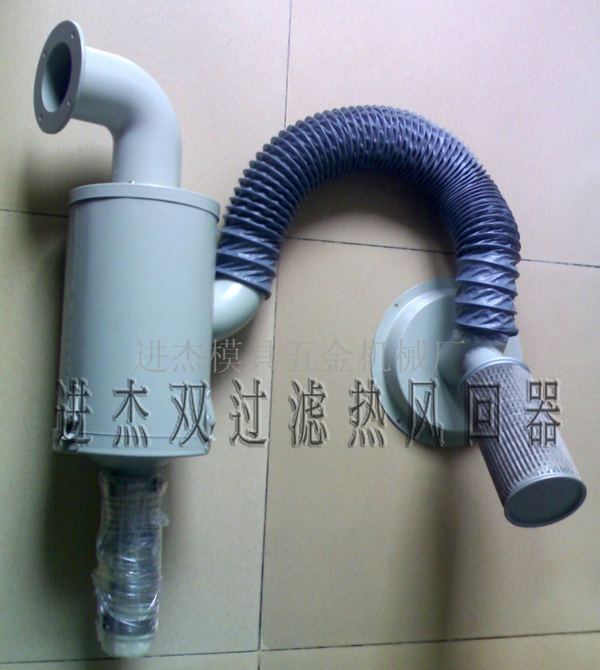 注塑车间的湿气,主要来自料斗干燥机中排出的废气,而高温主要是料斗干燥机和注塑机的加热系统。热风回收系统,是直装安装于料斗干燥机上,利用干燥机的鼓风机,将干燥机排出的废气再次吸入干燥机中,无需另接电源,形成热风的回收。而热风回收系统自带有两个滤清器,可以将粉尘过滤后再回收。因为吸入干燥机的是干净的热空气,可以节省干燥机20-30%的加热电能。这样,热风回收系统的使用,利用废气的循环利用,即节省了电能,也降低了厂房内的温度,同时也清洁了空气。