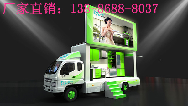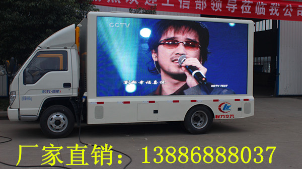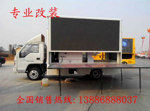 多媒体流动LED广告宣传车,宣传演播车,采用全电脑控制,并配有静音发电机。右面是大型户外全彩LED屏,鲜丽明亮、光彩夺目。可播放各种光盘、U盘、MP3、MP4等数码音像资料。当开业、促销、庆典或现场直播等固定演播时,全彩LED屏可液压升起,下面可做主席台、演出台及促销场地。左上面LED单色滚动条屏,可灵活、滚动、循环播放各种文字广告。 左下面是带照明,可设定时间间隔,循环滚动多幅广告画面装置。可播放多画面平面广告。