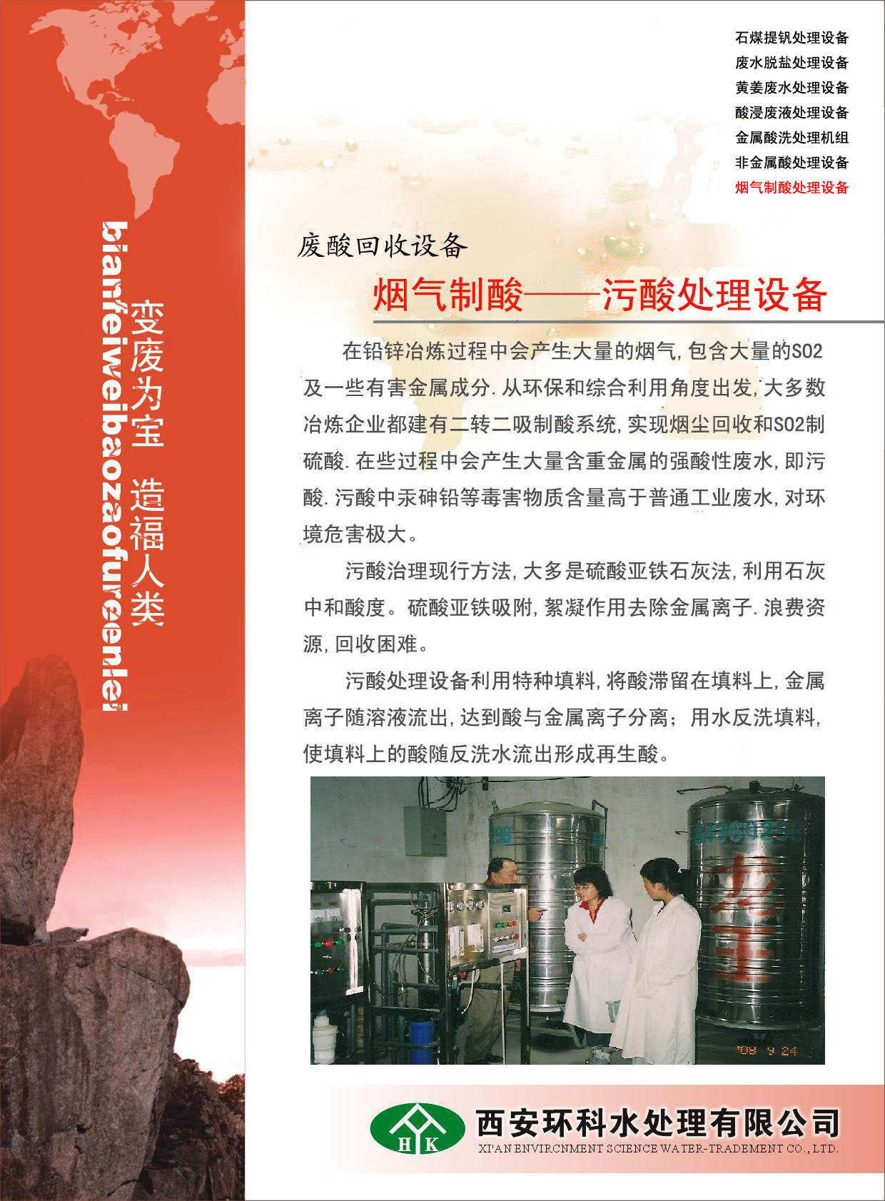 电解锌废液主要成分为硫酸锌、硫酸和水。杂质成分主要有少量的金属盐、部分阴离子(Cl-、F-)。随着锌的析出,电解液成分逐渐变化,到一定程度必须添加新的电解液进去。而使用过的废电解液就要排出,不然电解槽中就容纳不下相应体积的电解液。而废电解液排出不能长期存储在企业,必须经过处理,要么达标排放,要么零排放。而要实现这两个目标,处理的方法还是比较多的。但西安环科研制的电解锌废酸处理设备是目前国内外较先进的设备。该设备具有其他方法处理设备不能具备的优点: