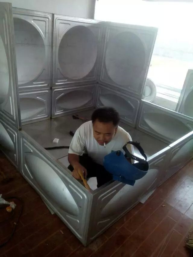 专业技师现场钨极氩弧焊接,选用ER308,H0Cr21Ni10不锈钢生活水箱专用焊丝。施工现场有标准电源,水箱四周及顶部有≥500mm的安装检修空间。外观检验无锈蚀,无污物,注满水24小时,箱体无明显变形,焊缝无渗漏为合格。