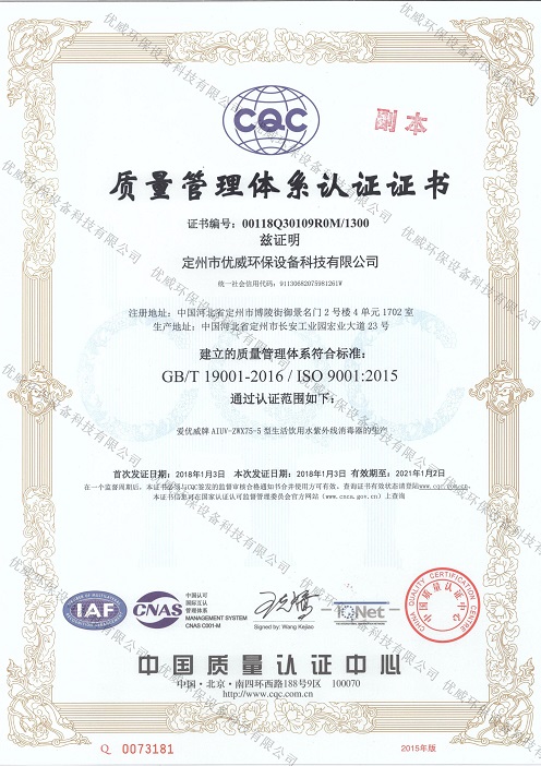 定州市优威环保设备科技有限公司资质齐全 有检测报告 有饮用水卫生许可批件 有消毒产品生产企业卫生许可证 产品经ISO 9001检测认证 品质保障 项目后期验收无忧