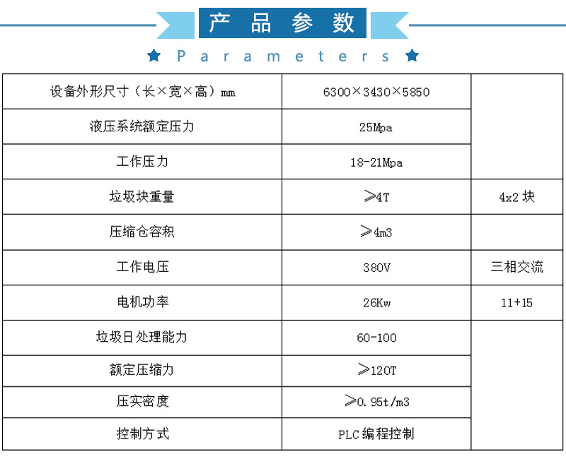 2.垂直式垃圾压缩机采用垂直预压方式,压缩力大,垃圾块压实密度高;