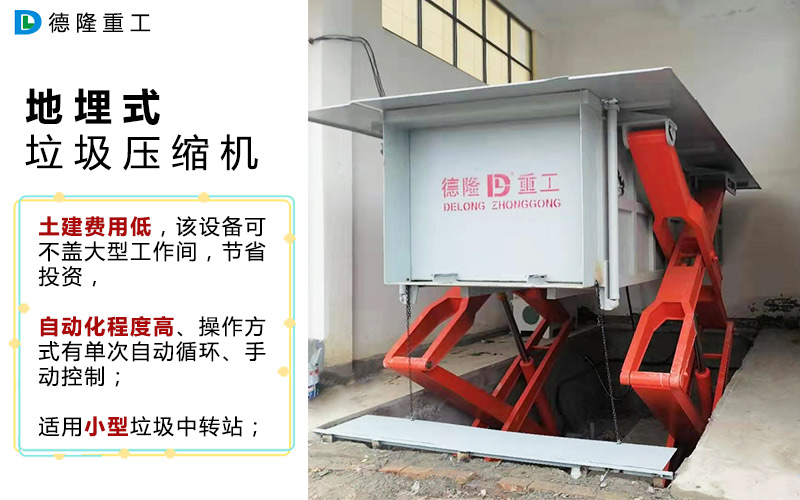 地埋式垃圾中转站置于地下1.5米左右,在地面上只露岀—个投料口,垃圾收集车从投料口倒入在垃圾压缩仓内,利用遥控器进行压缩操作后,水平压缩油缸推动推板向前进行垃圾的压缩,垃圾压缩成块后,垃圾所产生的污水经环保处理后排入地下管网。