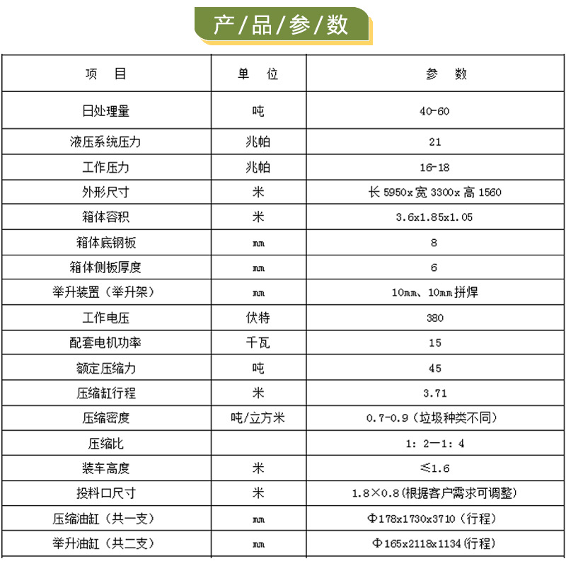 地埋式垃圾站的储存仓与压缩仓结合一体,结构设计紧凑合理,升降系统采用液压控制、性能稳定、耐用性高;地埋式垃圾站利用液压系统控制,将垃圾在密封的储存仓内强制压缩,使一般生活垃圾的压缩比达到2—3:1以上,压缩后体积缩小、密度增大、减少外运次数、降低清运费用,本设备具有自动排污水功能,在垃圾压缩过程中产生的污水或雨水等将通过地坑底部的自动排水系统将污水排入污水管网,消毒灭蚊蝇系统可以在操作过程中自动将药液喷到垃圾上,达到消毒杀虫、灭蚊蝇、除尘除臭等目的,改善环境质量,同时还可选装自动遥控装置,可通过遥控器操作整个垃圾站的各个动作,降低劳动强度,一人可管理多个垃圾站。
