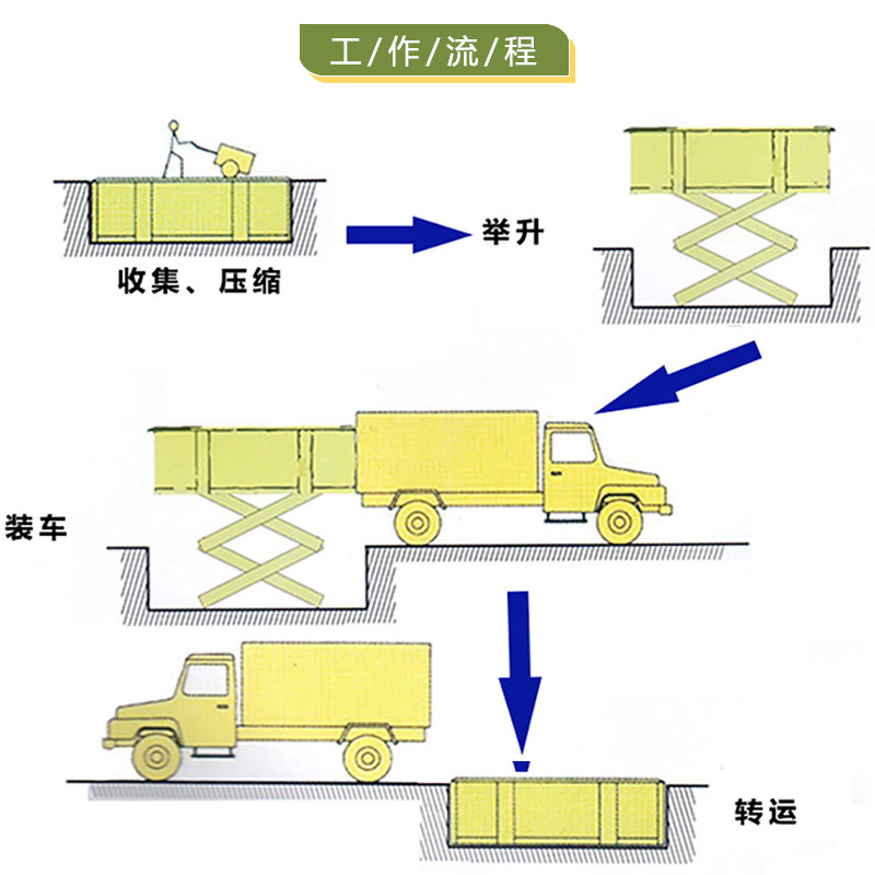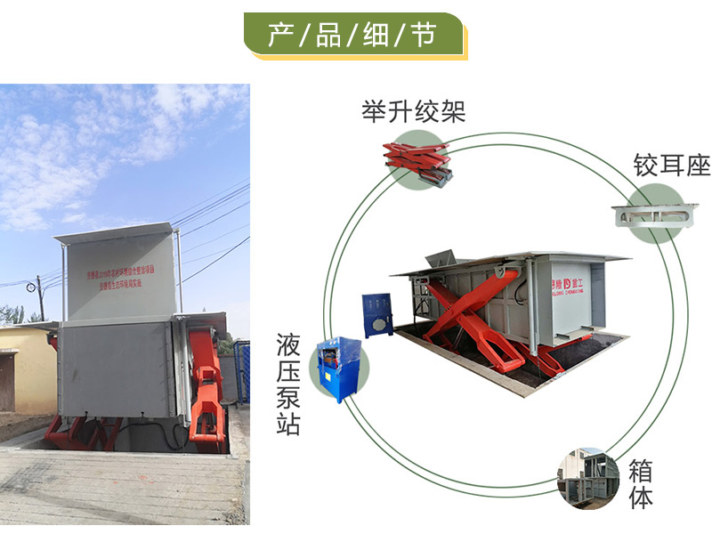 垃圾箱体在举升油缸的驱动将举升绞架向上动作,升岀地面与垃圾转运车对接,由水平压缩油缸推动推板,将垃圾推入运输车封闭箱内;操作完以后,再自动将垃圾箱回位到地面以下;由此往复完成垃圾全封闭储存、转运的环保过程;提高了转运效率,降低了转运成本。