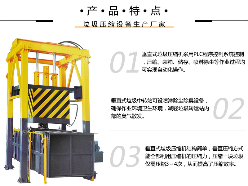 垂直垃圾压缩中转站设备是一种符合环保要求的新概念的生活垃圾收集设施,采用液压系统控制,将垃圾在密封的储存仓内强制压缩,使一般生活垃圾的压缩比达到3:1以上,压缩后体积缩小、密度增大、减少外运次数、降低清运费用。