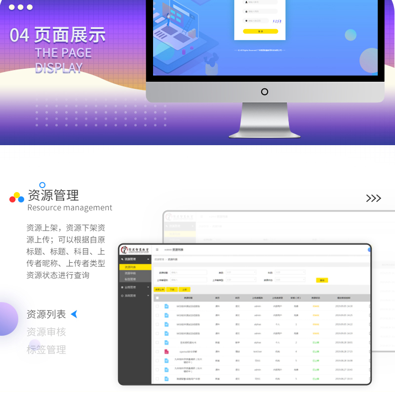 用户可对资源进行上架、下架和上传,可根据标题、科目、上传者昵称、上传类型资源进行查询。