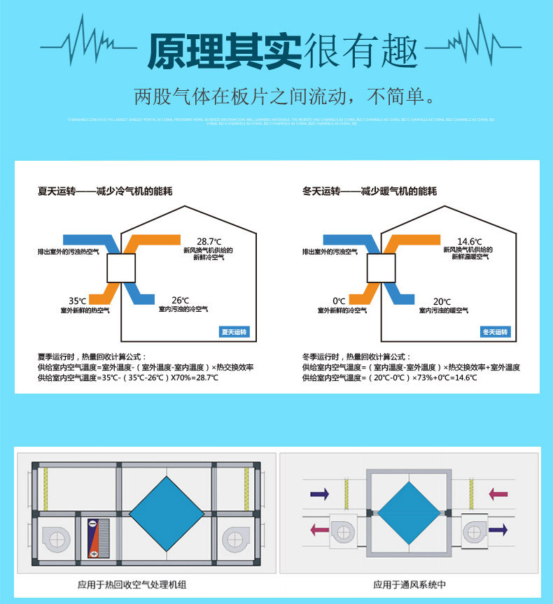气-气换热器(可作板式冷却器、散热器、预冷器)及空气余热回收产品系列有:纸质纤维隔层ABS框架全热回收纸芯体、铝箔/不锈钢/环氧树脂等显热交换芯体、机柜热交换器,芯体外形多样:逆流芯、穿插流芯、正方形芯、长方形芯、六边形及菱形芯等;(冷)热交换芯体产品应用于各种通风换气设备的热交换(例:新风系统设备,余热回收设备),以及机房、基站、机柜换热节能系统等各种能量回收场合的热交换。