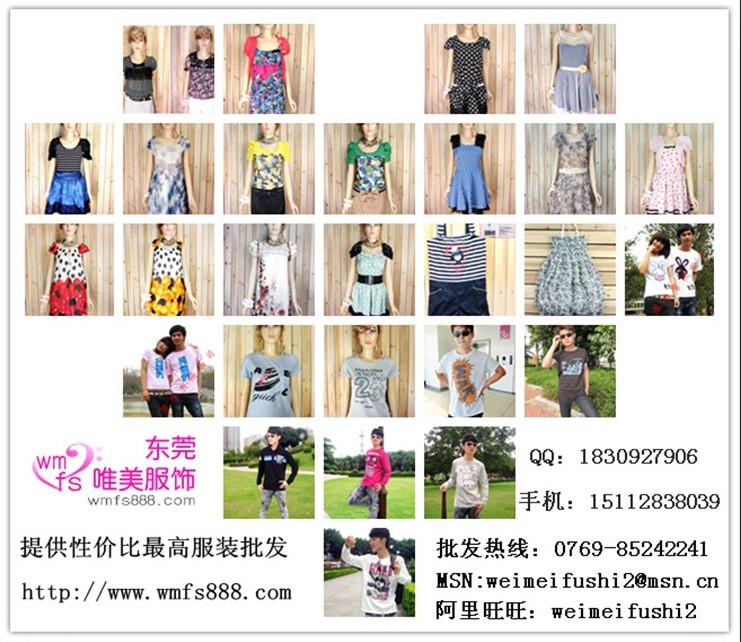 广州服装批发市场广州服装批发网广州服装批发东莞唯美服饰有限公司库存服装批发联系方式,联系人:吴先生 固话:0769-85242241 手机:15112838039 QQ:1830927906 MSN:weimeifushi2@msn.cn 阿里旺旺:weimeifushi2 公司网址:hppt://www.wmfs888.com 东莞唯美服饰有限公司广州库存t恤批发女式韩版T恤批发最新款便宜靓丽又新潮的T恤吗?风向标服饰现刚刚上市几款女式韩版T恤,样式新颖,既休闲大方又特显个性,混批100件起批。另有更多款式热销中,女短T恤4.8元/件起,男短T恤6.8元/件起。欢迎各界朋友现场看货选货咨询!新到一批全新款式的T恤欢迎新老顾客前来订购。