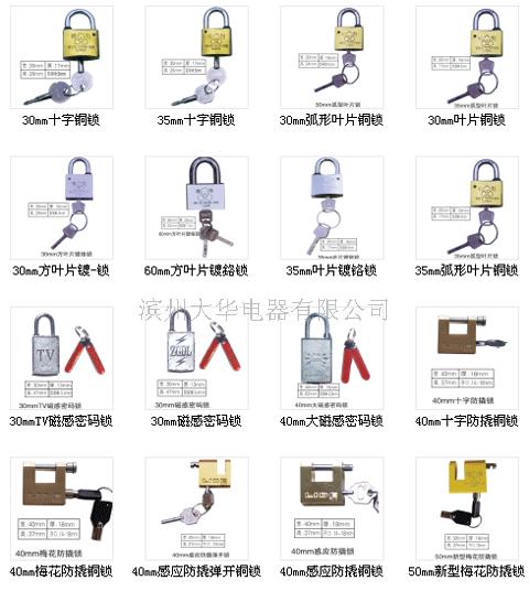 产品型号:大华电器专业生产各种(铜锁,铜挂锁,塑钢锁,不锈钢锁,通开锁,通开挂锁,合金五金锁具,大华电表箱锁,  电力锁,电力挂锁,电力铜挂锁,防水挂锁,表箱锁,四方锁,  长钩锁,电力锁具,长梁挂锁,长梁铜锁,叶片锁,变压器防盗锁,梅花锁,十字锁,铜挂锁,防水表箱锁  ,表箱挂锁,表箱锁,表箱长钩铜锁,方叶片镀铬锁,塑钢防水锁,铜长钩锁,长钩挂锁,磁感密码锁,表箱挂锁)