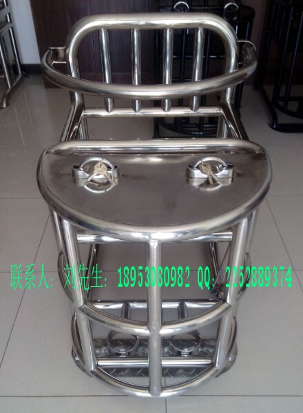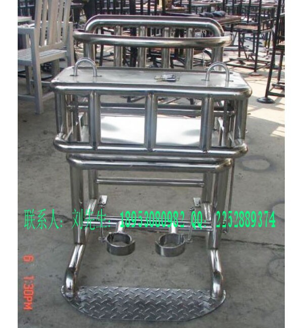 材质:管壁厚度为贴标2.0mm工业管,座面不锈钢板厚度为贴标1.8mm,桌面不锈钢板厚度为贴标1.8mm,扶手不锈钢管厚度为贴标2.5mm,伸缩腿管壁厚度为贴标1.8mm,脚部约束环采用5.0mm厚工业不锈钢板制成,胸部约束带钢板厚度为贴标3.5mm。
