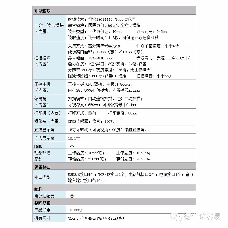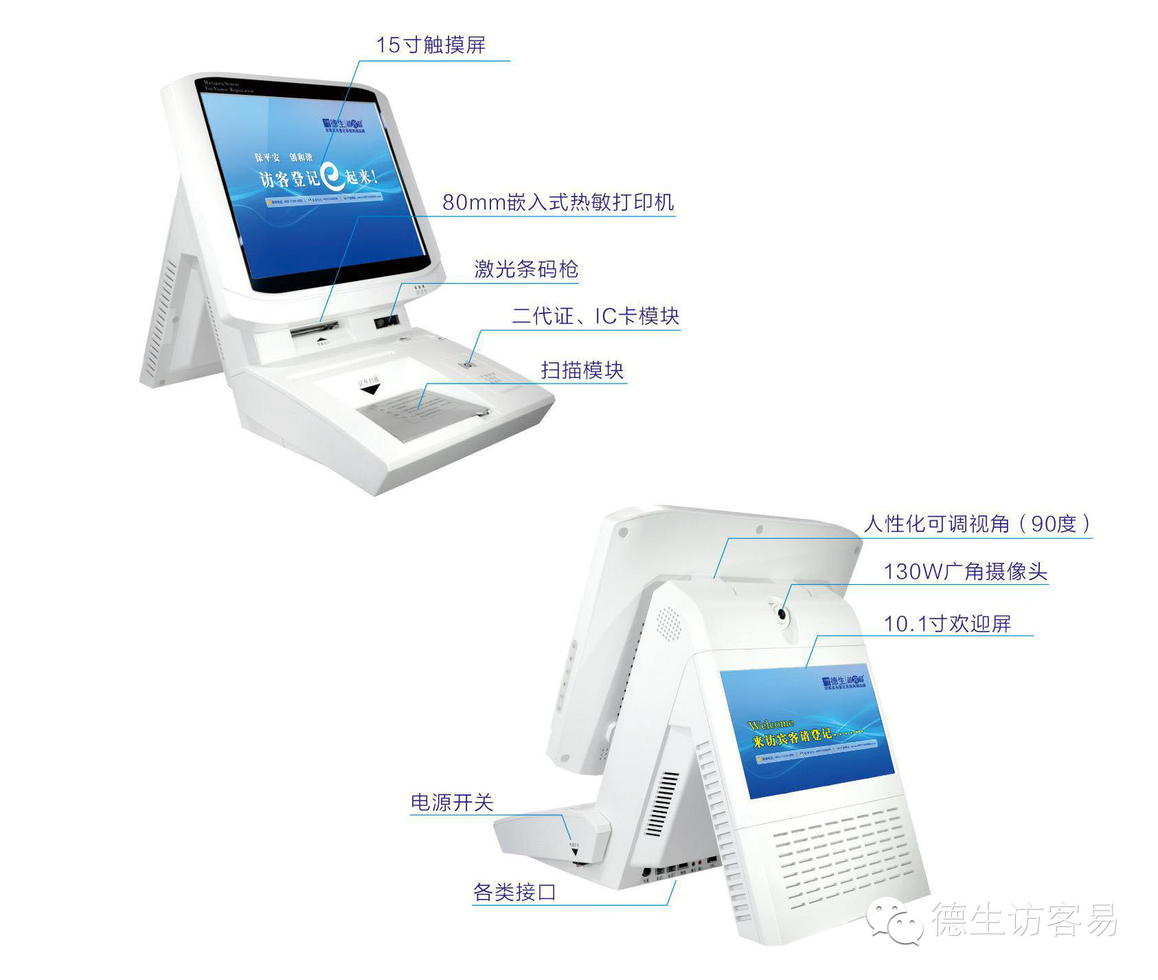 德生访客易旗舰版TSV-5S座式一体机,双屏显示+流线机身设计凸显大气,适用于政府、公安、司法机关、500强企业等管理形象要求高、个性化服务强、管理严格的高端用户,同时集成主机、读卡模块、显示器、打印模块、摄像头、存储模块于一体,满足了用户对品质、技术、外观、空间的综合要求,成为高端用户的首选机型。
