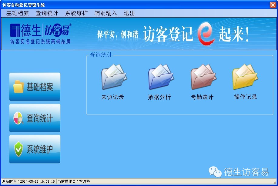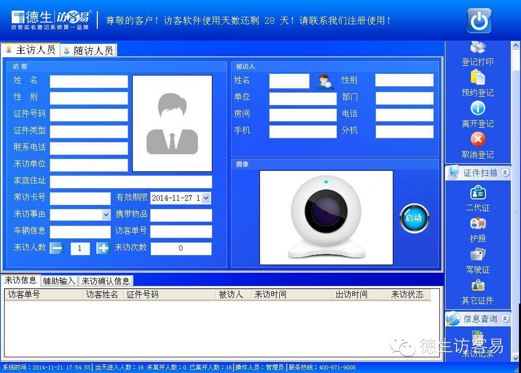 我公司与德生共同推出了访客易,访客易又称“访客自动登记安全管理系统”,该产品针对企事业单位来访宾客登记人工管理这一薄弱环节而研发。该系统充分利用现代化信息技术,代替手工来访登记,实现访客全面数字化管理。在四川联通、东方汽轮机有限公司等多家单位有成功应用。