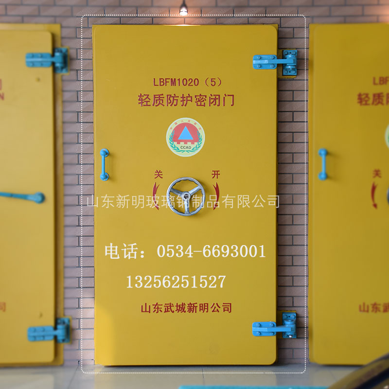 山东新明玻璃钢制品有限公司,是一家为人防通风系统、人防水电工程、地下车库设备安装及人防专用设备配套为主的新兴企业。是国家人防办人防工程防护设备的定点生产厂。是人防工程防护设备行业革命性的变革,轻质人防门闭锁采用四连杆驱动滑栓式闭锁,重量轻、结构简单、操作简便。和传统钢筋混凝土、钢结构防护设备相比,减轻了重量,便于安装,另外门扇表面采用低温烤漆工艺,后期免于维护。轻质人防门还具有生产率高、良好的绝缘性、隔音性、阻燃性、防潮性及外观美观等诸多优点。该人防门采用SMC复合材料,运用模压工艺生产而成,产品密闭性能好,且具有重量轻、强度高、耐腐蚀、寿命长等优点,以及良好的绝缘性、隔音性和阻燃性。完全可以替代现行的钢筋混凝土密闭门。山东新明公司将竭诚为人防设备客户和国防工程建设做出新的更大贡献!
