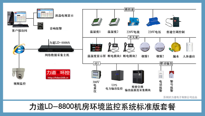 在机房安装力道LD-8800系列机房监控主机和相应的采集传感器,实现对机房的全面监控,并对5个重要的服务器机柜微环境温度进行监控,在重大事故发生之前,有异常迹象出现时,可以通过邮件、手机邮件(短信通知)、电话等多种方式提示管理员处理,从而确保计算机网络和设备的正常运行。