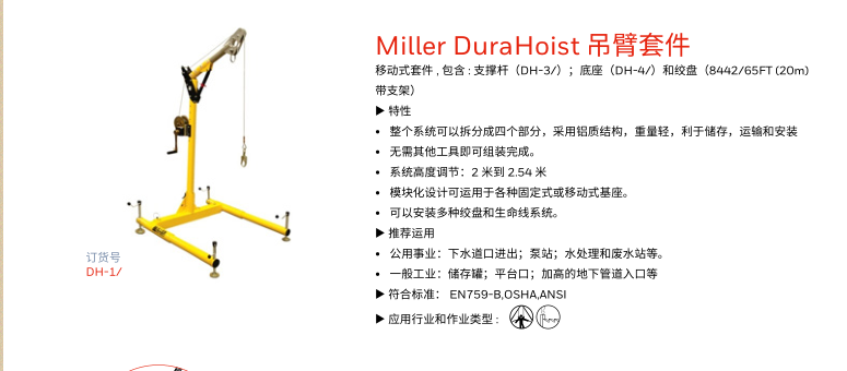霍尼韦尔DH-1/Miller DuraHoist吊臂套件包含:支撑杆(DH-3/);底座(DH-4/)和绞盘(8442/65FT(20m)带支架)