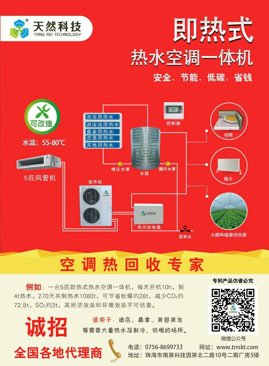 天然科技 生产各类新型制热水设备,把热量回收,循环再用,实现开空调免费制热水。开空调的同时最高可以制100摄氏度热水。为全国各行业提供节能减排解决方案。广泛用于,酒店、宾馆、、宿舍、别墅、工厂、院、廊等地方,实现 免费 热水的供应。现在全国招经销代理,专业的技术培训,8项明专利支持。欢迎每一位来咨询的客户,也诚邀您能到我公司考察。固话:07568699733