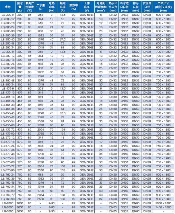 1.容量200升(52加仑)--3000升(800加仑)一体式大型容积式热水器;