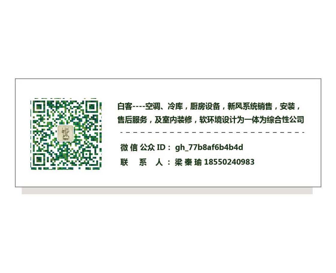 白客公司是空调,冷库,厨房设备,新风系统安装、维修、保养,及室内装修,软环境设计为一体为综合性公司!