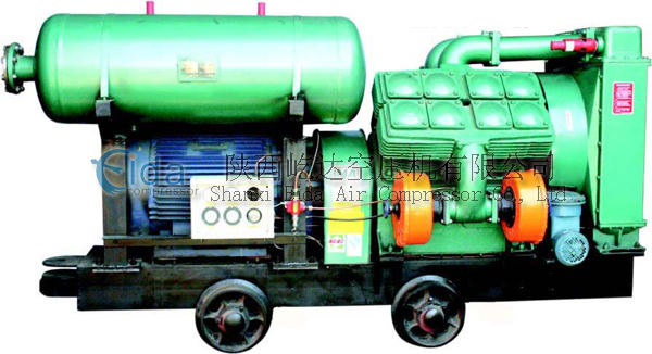 煤矿用井下移动防爆活塞空气压缩机型号:MVF-10/7 排气量10m3/min,额定工作压力0.7Mpa,电机55KW,转速980r/min,净重2300Kg,外型尺寸L×W×H:2490×1300×1415mm。