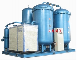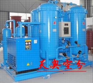 工业制氮机说明,富阳天奥空分设备有限公司是一家股份制高新技术企业,是一家集研究、开发、制造制氮机(PSA制氮设备)、工业制氧机(PSA制氧设备)、制氮设备(低温深冷空分氮氧分离)、气体纯化、压缩空气净化等气体设备,还承接各种气体非标设备的设计、制造和技术咨询。制氮机工作原理,制氮机是根据变压吸附原理,采用高品质的碳分子筛作为吸附剂,在一定的压力下,从空气中制取氮气。经过纯化干燥的压缩空气,在吸附器中进行加压吸附、减压脱附。由于空气动力学效应,氧在碳分子筛微孔中扩散速率远大于氮,氧被碳分子筛优先吸附,氮在气相中被富集起来,形成成品氮气。然后经减压至常压,吸附剂脱附所吸附的氧气等杂质,实现再生。一般在系统中设置两个吸附塔,一塔吸附产氮,另一塔脱附再生,通过PLC程序控制器控制气动阀的启闭,使两塔交替循环,以实现连续生产高品质氮气之目的。整套系统由以下部件组成:压缩空气净化组件、空气储罐、氧氮分离装置、氮气缓冲罐。