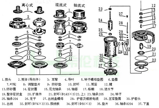 水泵部分:位于潜水泵上部,与电动机同轴,其叶轮形式有离心式混流式和轴流式三种。