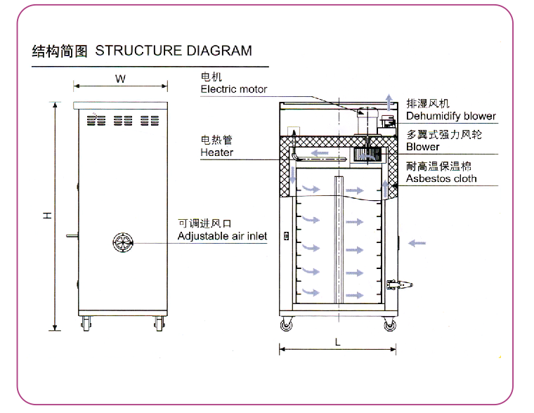 将需烘干的物料放入活动料盘中,当接通电源运行时,强力风轮启动迫使由进风口进入的空气吹向电热管,空气经过电热管加热升温,并穿过带孔的隔墙,均匀吹向物料,携带了水分的空气将由顶部的排湿风机抽出烤箱之外。如此反复循环则达到排湿、干燥之效果。