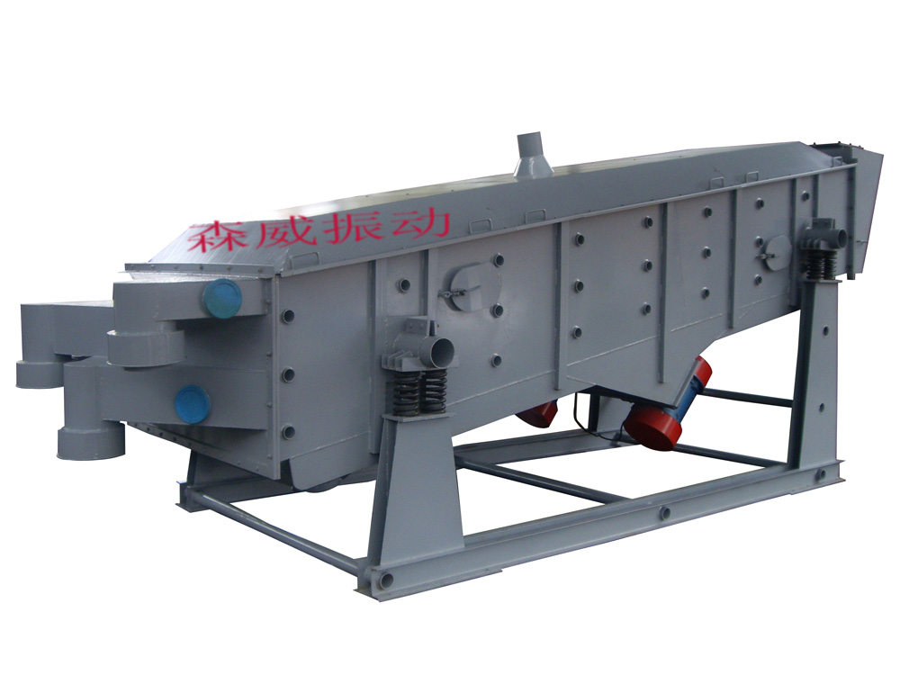 直线振动筛是双振动电机驱动。当两台振动电机做同步、反缶旋转时,其偏心块所产生的激振力在平行于电机轴线的方向相互抵消,在垂直于电机轴的方向叠为一合力,因此筛机的运动轨迹为一直线。两电机轴相对筛面有一倾角,在激振力和物料自重力的合力作用下,物料在筛面上被抛起跳跃式向前作直线运动,从而达到对物料进行筛选和分级的目的。适用于粒度在0.074-5mm、含水量小于70%、无粘性的各种干式粉状物料的筛分。最大给料粒度不大于10mm。