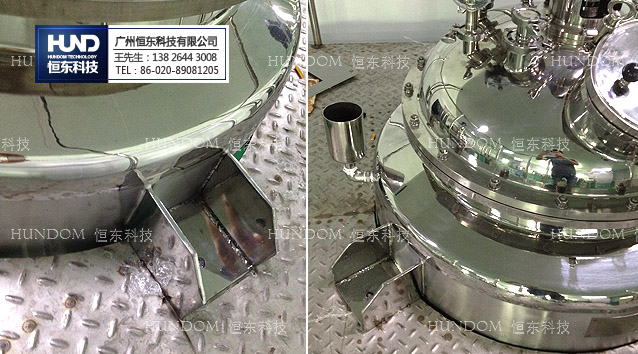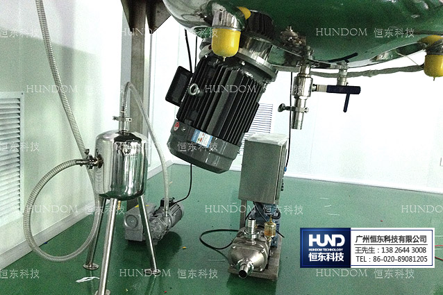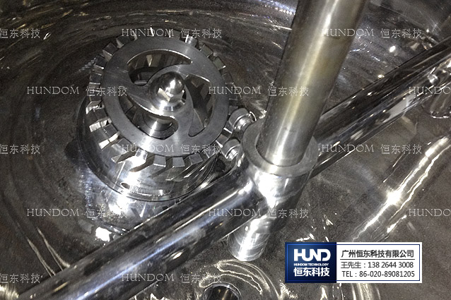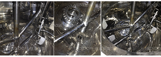 原理:离心式高速乳化头在工作时可产生巨大的旋转吸力,将转子正上方的物料旋转着吸下,然后高速抛向定子,经过转定子间的高速剪切、碰撞、粉碎后,物料汇集至出口而喷出。同时罐底防涡流挡板将旋转力转化为上下翻腾力,从而使罐内物料混合均匀,防止粉料在液面堆积聚团,而达到水合乳化的目的。