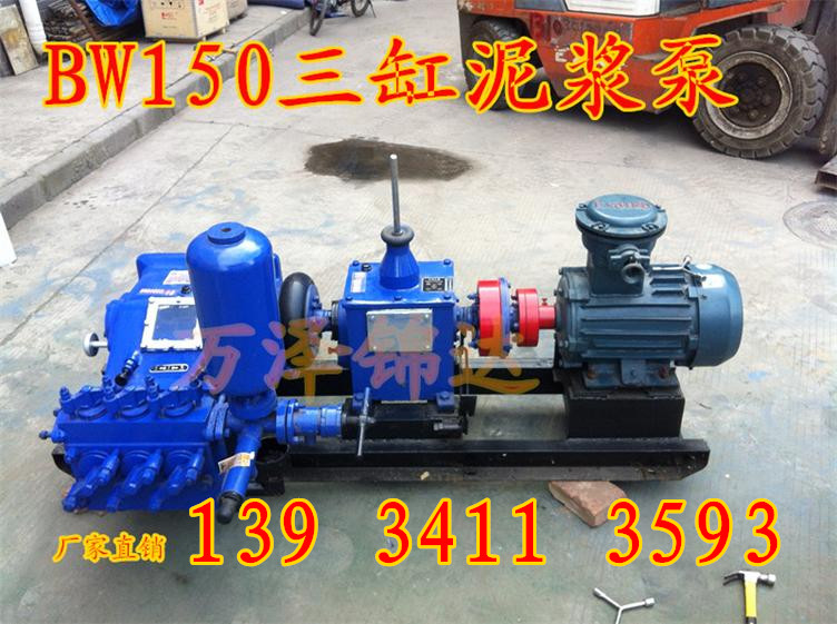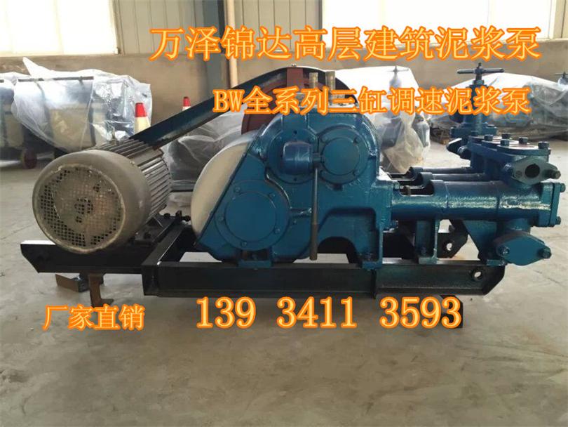BW-250型(注浆泵)泥浆泵:为卧式三缸往复单作用活塞泵,该泵具有两种缸径和四档速度。排量和孔深根据用途随意调节,最深可和1500米钻机配套使用,也可用于水泥浆灌注,本泵耗能少,操作灵活,优质耐用,分解性好,易于搬迁。