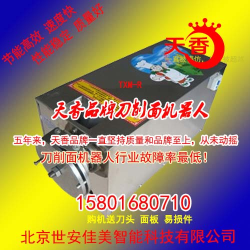 刀削面机器人是一款价钱实惠的机器,这款机器人刀削面机是非常理想刀削面馆设备,天香牌机器人刀削面机才采用优质304不锈钢制造,生产出来的刀削面符合了国家食品卫生的标准,刀削面机器人是一款设计更加合理的刀削面机器,而且这款刀削面机器的结构非常紧凑,并且机器的外形更加美观和整洁,在运行过程中的时候噪音非常低、生产刀削面的效率高,每分钟180条面,并且这款机器还具备了自动化生产刀削面的效果,定量的时候更加的准确,生产出来的刀削面长短统一、外形美观,而且我们厂家还会提供更加优质的服务,让广大购买机器的消费者们可以得到更加全面的保证。北京天香第七代智能刀削面机器人,质量好,性能稳定 秦经理 15801680710 QQ787169896 微信bjtxjm www.xttianxiang.com