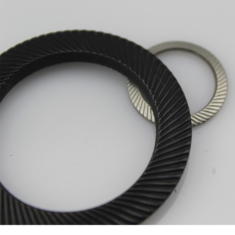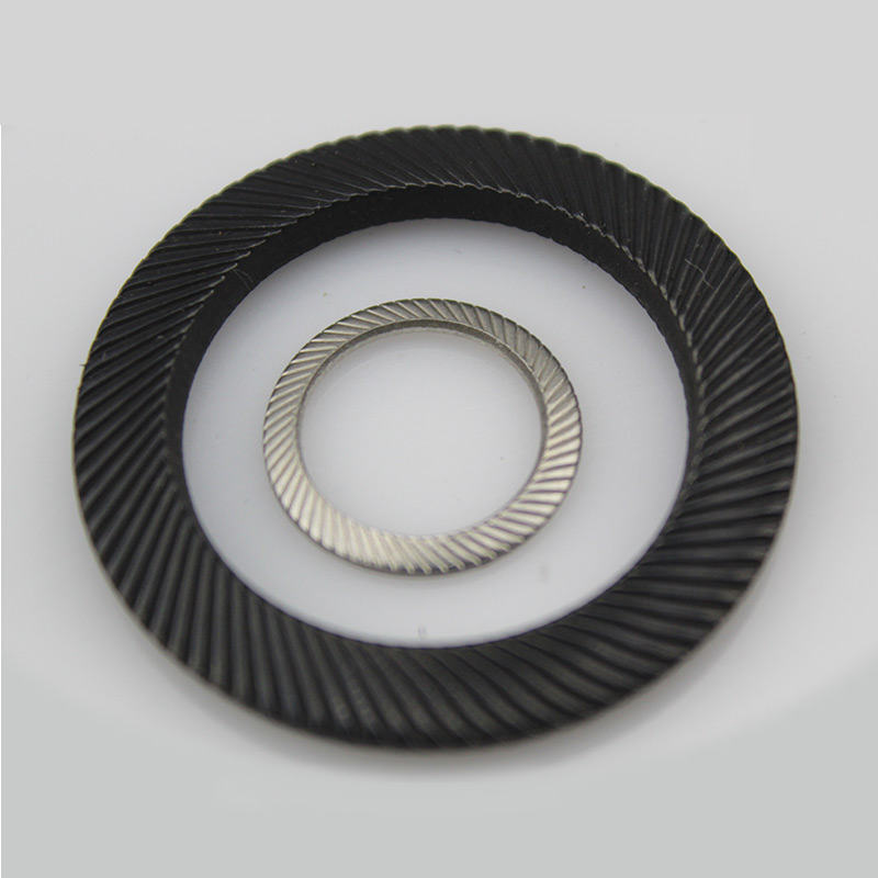 这是一种弹性补偿元件,有效地解决了法兰连接中的螺栓预紧力松驰问题。当螺栓拧紧时,进口防松碟簧吸收机械能转化成位能(势能)储存在碟簧中,当设备由于温度变化、压力变化或机械振动导致螺栓的预紧力松驰时,防松碟簧释放位能(势能)转化成机械能,对于螺栓的预紧力进行补偿,使螺栓的预紧力始终保持在垫片密封所需要的预紧力范围。