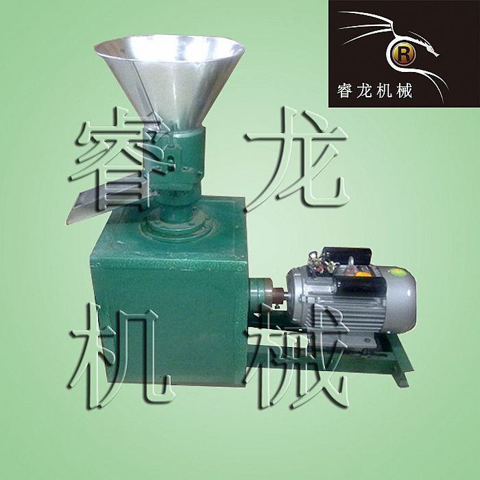 而由于其压力过大,压制的精饲料的密度很大,所以在这方面遥遥领先。 饲料颗粒机主要由喂料、搅拌、制粒、传动及润滑系统等组成。曲阜市睿龙机械厂专家指出,饲料颗粒机工作过程要求含水量不大于15%的配合粉料,从料斗进入喂料绞龙,通过调节无级调速电机转速,获得合适的物料流量,然后进入搅拌器,通过搅拌杆搅动与蒸汽混合进行调质,如果需要添加糖蜜或油脂,也从搅拌筒加入与蒸汽一起调质,这是与同类压缩成型设备的重大区别。油脂添加量一般不超过3%,否则难于成形,经调质后配合粉料温度可达64~85℃,湿度达14~l 6%。然后再通过斜槽经过可选择的吸铁装置除去混在粉料中铁杂质,最后进入压制室进行制粒。不出现轮与模的错位摩擦,减少了阻力,降低了动能损耗,延长了模具的使用寿命,进料均匀可靠,产量高,能耗低,适用于物料比重为0.3-0.6g/cm3的轻质物料制粒。