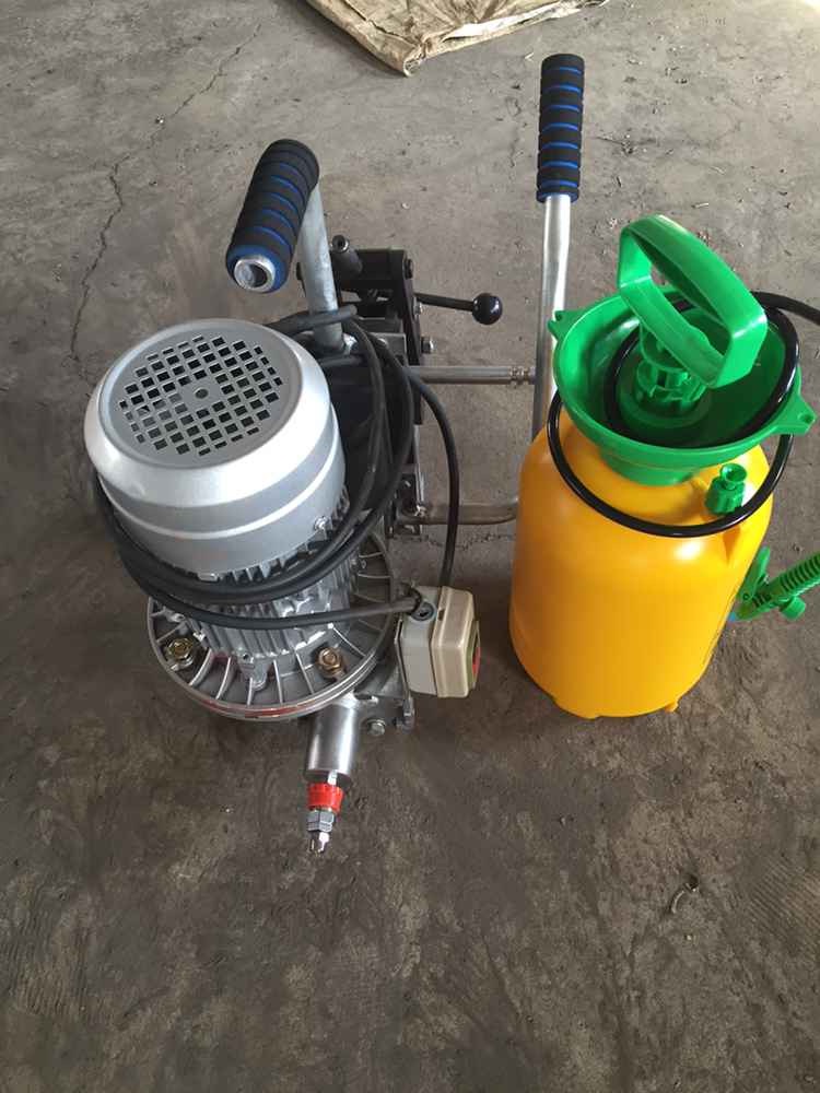2、先给注水桶11打气加压(一般在10下左右),将水阀12压下后向前推即为打开状态,然后启动汽油机,在各部件工作都无异常的情况下,扳动进给扳把9均匀进给,钻头芯接触钢轨后,冷却液自动流出对钻头冷却,如没有冷却液流出,请检查注水筒,待故障排除后方可进行钻孔。