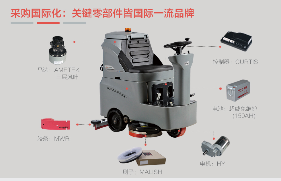 超高配置:HLM驱动电机,轻松过减速带,HY刷盘电机,美国AMETEK三层吸水电机,美国柯蒂斯控制器,美国马利希刷盘,超威免维护电瓶。